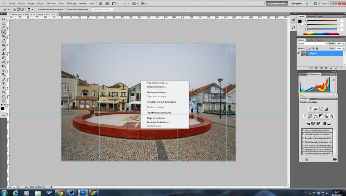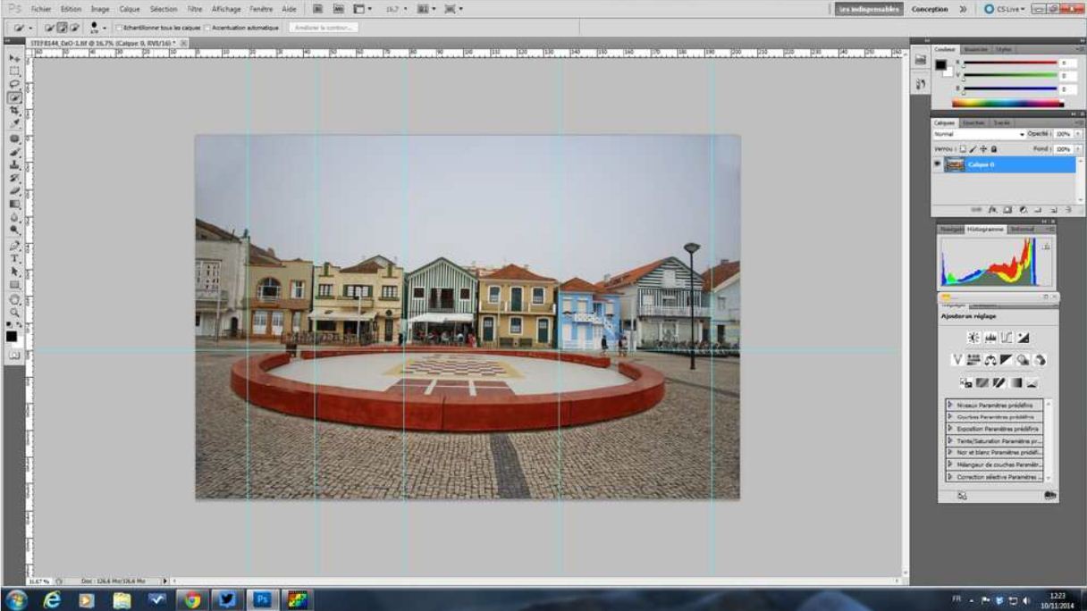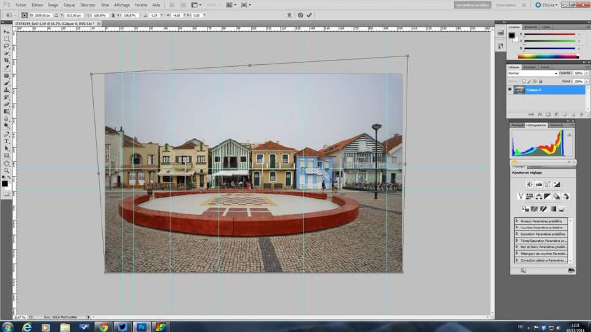 Posté(e) 10 juillet 20178 a Redresser les perspectives facilement avec photoshop Souvent en architecture, en ville, nous manquons de recul, alors nous utilisons de courte focale ce qui occasionne des perspectives qui ne sont plus droite. A travers ce tutoriel nous allons voir comment redresser les perspectives simplement avec photoshop. Voici notre image de base déformée : On ouvre notre image dans photoshop: Ensuite il vous faut afficher les règles: affichage -> règles Maintenant vous avez des graduations à gauche et en haut: Pour pouvoir définir nos perspectives il nous faut des repères, vous allez cliquer sur la graduation de gauche, laissez votre clic enfoncé et faite glisser jusqu'à l'endroit qui montre une distorsion et qui est à redresser: Mettez des repères autant que nécessaire, la graduation de gauche vous donnera les verticales et la graduation du haut les horizontales Passez maintenant votre image en calque d'arrière-plan :Calque ->nouveau -> calque d'arrière-plan Votre vignette à droite doit passer de "arrière-plan" à "claque 0" faite un clic droit sur votre image et cliquez sur "transformation manuelle" Une ligne est tracée sur les quatre côté de votre image avec des carrés à chaque angle et sur chaque milieu Faite de nouveau un clic droit sur votre image puis sélectionnez "torsion" C'est à partir de ce moment-là que vous pouvez ajuster vos perspectives, il vous suffit de tirer sur les carrés situés sur les contours de votre image pour redresser Ajustez avec chaque carré selon les besoins de votre image, à gauche, à droite, vers le haut..... Vous pouvez rajouter de nouvelles lignes à l'aide des graduations. Une fois que vous avez terminé, vous validez par la touche entrée, les contours disparaissent. Il faut maintenant enlever les repères: Affichage -> Effacer les repères Repasser votre image en calque d'arrière-plan: calque -> aplatir l'image Vous avez votre image redressée