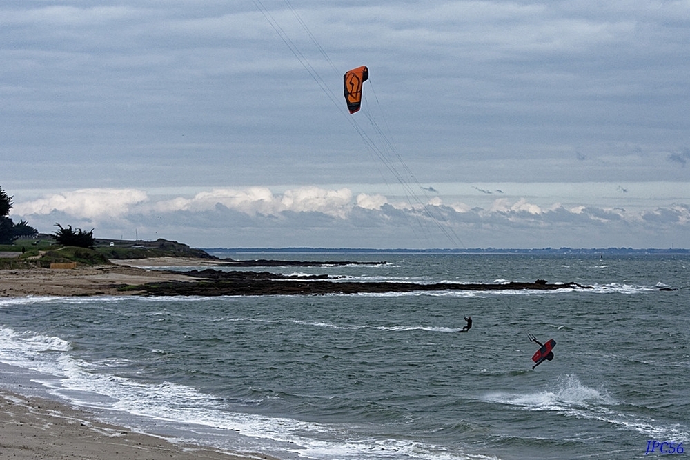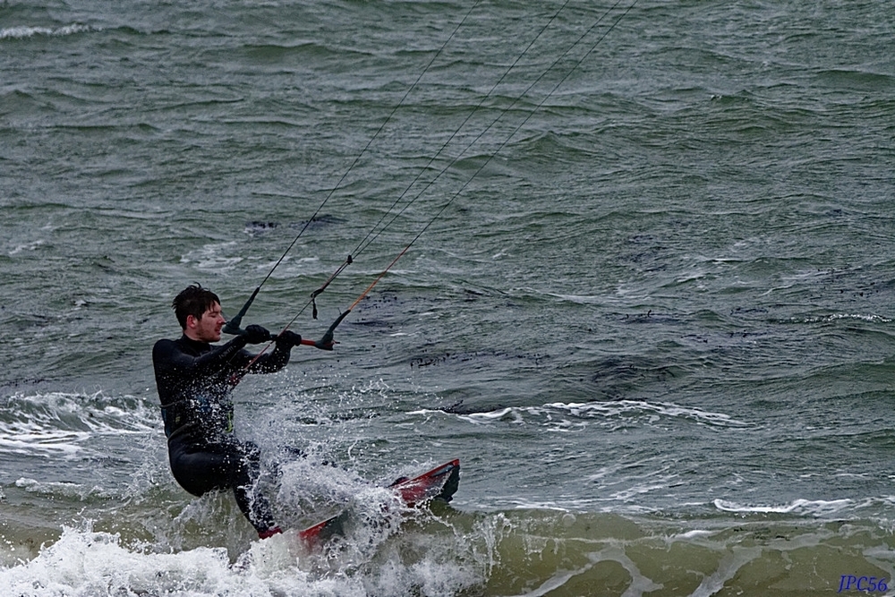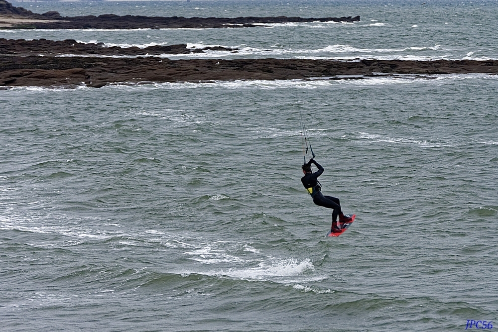 Posté(e) 13 avril 20233 a Auteur Beaucoup plus difficile à prendre l'ensemble, quand regarde d'autres photos de ce sport on a une majorité de photo dans cette configuration ! Démonstration : on voit les deux kits surfeurs celui qui sur l'eau est complet voile et personnage, par contre celui est en l'air on ne voit que les câbles mais pas la voile du faite de la grande longueur de ceci, si l'on veut l'ensemble on ne peut les prendre que de loin quand on est sur la plage, maintenant je ne dis pas que c'est impossible de les avoir en plan plus serré mais il faut être dans un axe le permettant, après pas toujours facile d'être au bon endroit, ici il fort possible que si je m'étais positionné sur la plage et les rochers que l'on voit au fond j'eusse pu avoir l'ensemble et encore pas sur 🤨! Modifié 13 avril 20233 a par JPC56