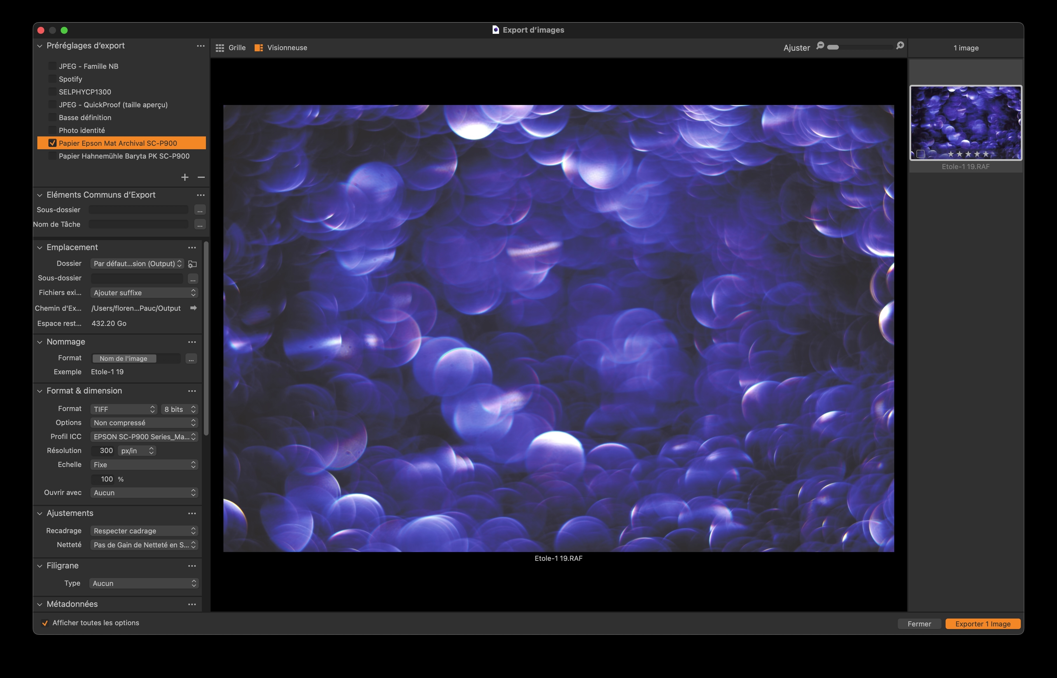 Posté(e) 20 avril 20251 a Bonjour à tous, J'ai fais l'acquisition d'une imprimante SC-P900 et j'essaye de la calibrer pour avoir un rendu à peu près similaire entre mon écran calibré et mon imprimante. Je suis perdu... Je viens de suivre la procédure pour créer un profil d'impression avec ColorChecker Studio (ccStudio) en utilisant le spectrophotomètre ColorChecker Studio de Calibrite, mais je rencontre quelques soucis avec mon imprimante Epson SC-P900 et du papier Mat Archival d'Epson. J'espère que quelqu'un pourra m'aider à résoudre ce problème. Contexte : Matériel : MacBook Pro 2023 Logiciels : ColorChecker Studio (ccStudio), Capture One Pro 16.5.9.7 Spectrophotomètre : ColorChecker Studio de Calibrite Imprimante : Epson SC-P900 Papier utilisé : Epson Mat Archival Étapes suivies : J'ai imprimé la charte ColorChecker en utilisant les paramètres recommandés par Epson pour le papier Mat Archival. J'ai laissé l'impression sécher pendant quelques jours. Pour les mesures, j'ai placé un même papier vierge sous l'impression afin d'assurer une base uniforme. J'ai mesuré la charte imprimée avec mon spectrophotomètre ColorChecker Studio de Calibrite. J'ai imprimé la deuxième charte générée à l'aide des précédentes mesures. J'ai importé les mesures dans ColorChecker Studio pour générer le profil d'impression. J'ai enregistré et installé le profil ICC généré. Problème rencontré : Lorsque j'utilise le profil d'impression généré, les couleurs ne correspondent pas à ce que j'attendais. Les impressions semblent avoir des couleurs délavées ou incorrectes. Ce que j'ai déjà vérifié : J'ai vérifié que l'impression de la charte était de bonne qualité et sans défauts. J'ai suivi les instructions du fabricant pour le séchage du papier. J'ai calibré mon spectrophotomètre avant de prendre les mesures. J'ai vérifié que le profil ICC est correctement installé et sélectionné dans les paramètres d'impression. Questions : Ai-je manqué une étape importante dans le processus de création du profil d'impression ? Y a-t-il des paramètres spécifiques dans ColorChecker Studio ou dans les paramètres d'impression de l'Epson SC-P900 que je devrais vérifier ou ajuster ? Est-ce que quelqu'un a déjà rencontré un problème similaire avec le spectrophotomètre ColorChecker Studio de Calibrite, l'imprimante Epson SC-P900, le papier Mat Archival, et Capture One Pro 16.5.9.7, et a trouvé une solution ? Merci d'avance pour votre aide ! Toute suggestion ou conseil sera grandement apprécié.
