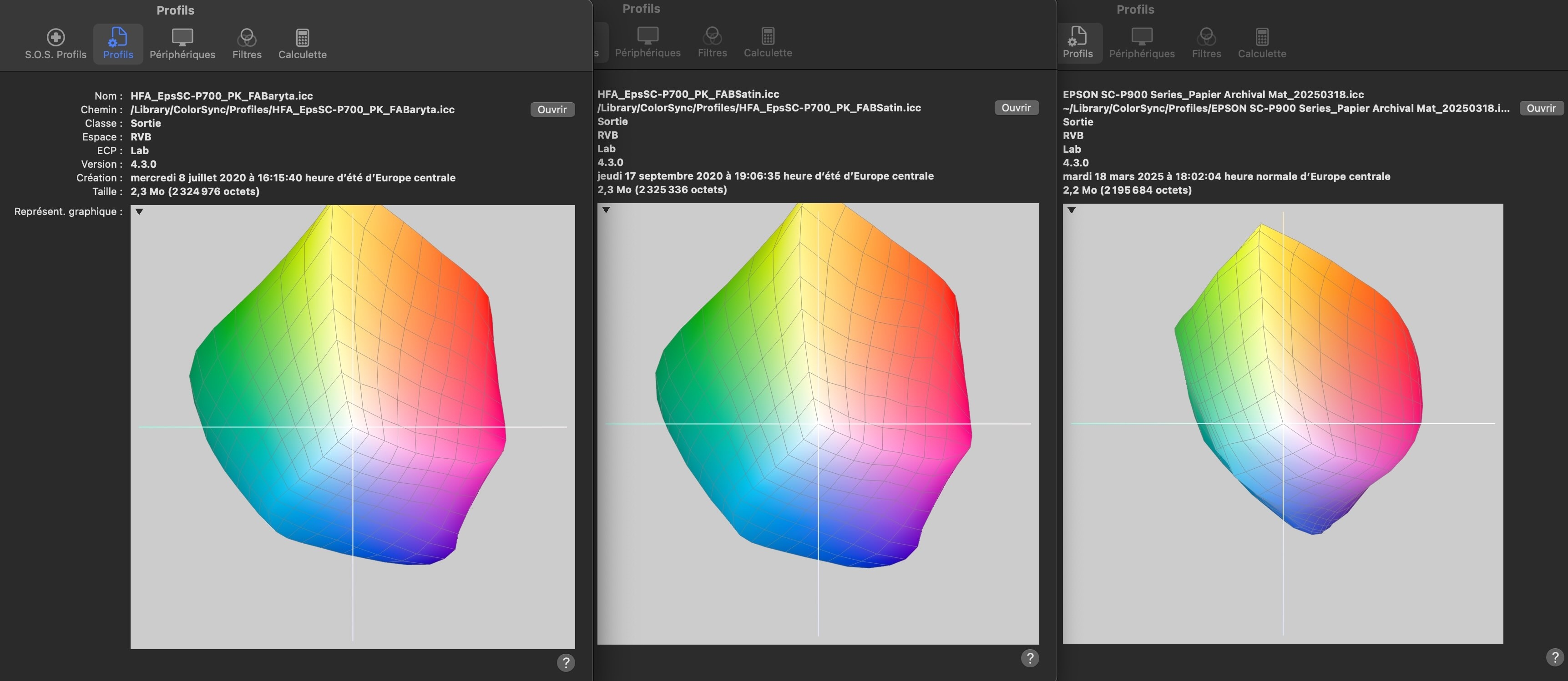 Posté(e) 24 avril 20251 a Auteur 1. Capture d'écran de l'épreuve sur Capture One du papier Baryta d'Hahnemühle 2. Capture d'écran de l'épreuve sur Capture One du papier Mat Archival d'Epson 3. Spectre colorimétrique (de gauche à droite): Baryta FA d'Hahnemühle Baryta Satin d'Hahnemühle Mat Archival d'Epson
